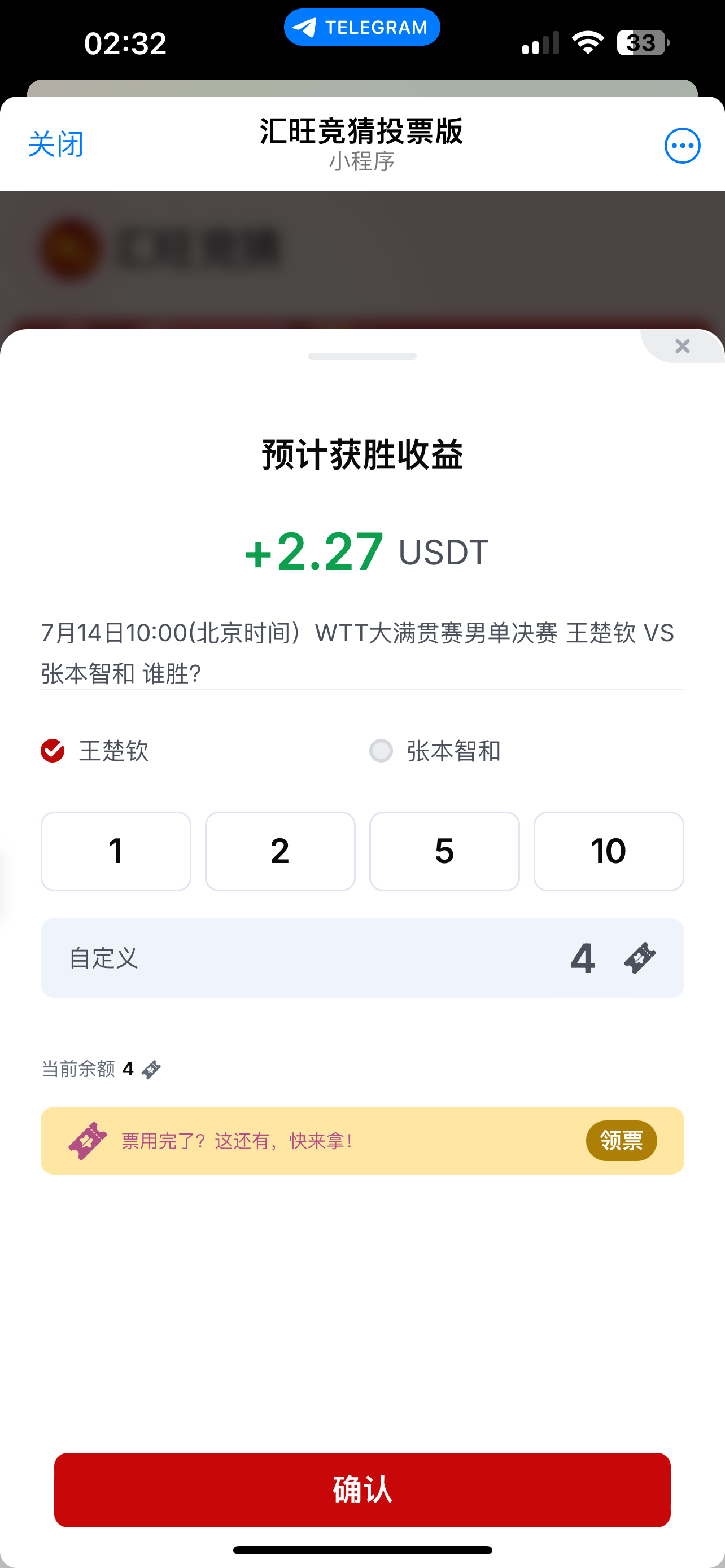 汇旺tg竞猜打开就有3-5票猜中就是2U+,赌神可以一直猜提款没有上限,提汇旺一u手续费地址2u可以跳人少的奖金投中的比较多