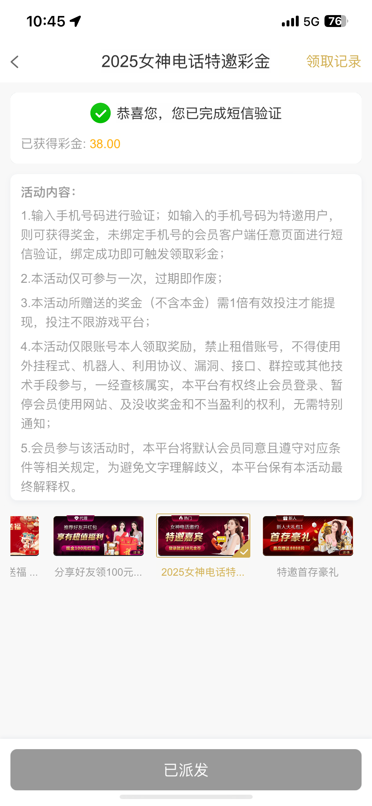 hh800119 可以领到,不过现在要充值50打够本金+38的流水才能领彩金,上了50打到210,提了250,谢谢老哥分享