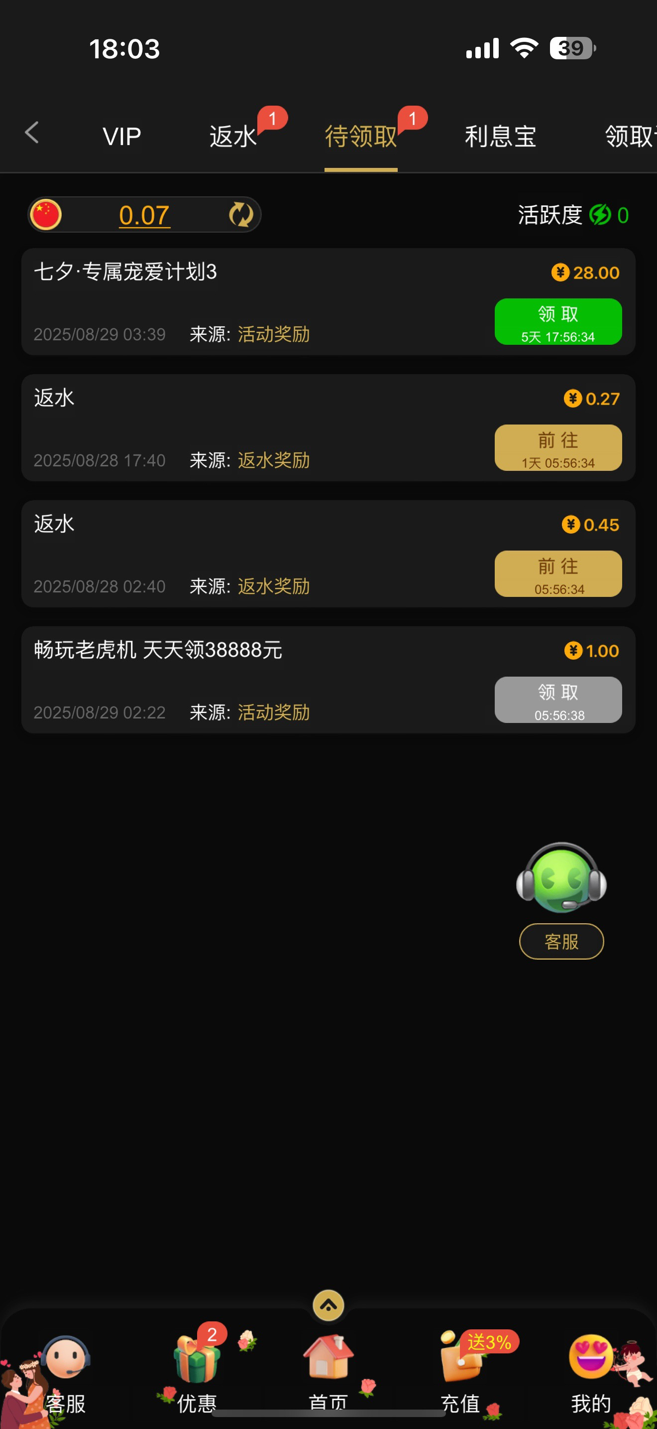 有充值的今天登陆去领取七夕彩金,平台还有新人注册下载app送18彩金