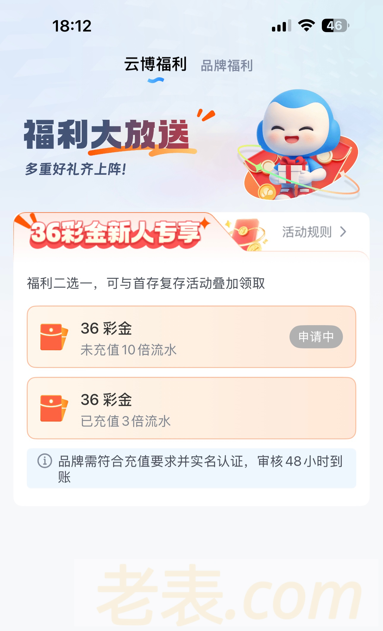 送的36彩金是要48小时内到账的,没弄过博系的老哥可以弄一下,可以先注册领取新人16彩金,然后等36彩金到就行了