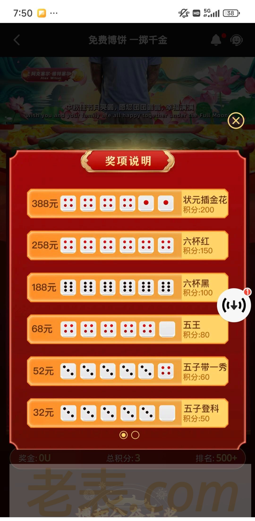 凯发k8中秋搏饼活动,有账号充值过一百以上登录每天免费3次抽奖最高388