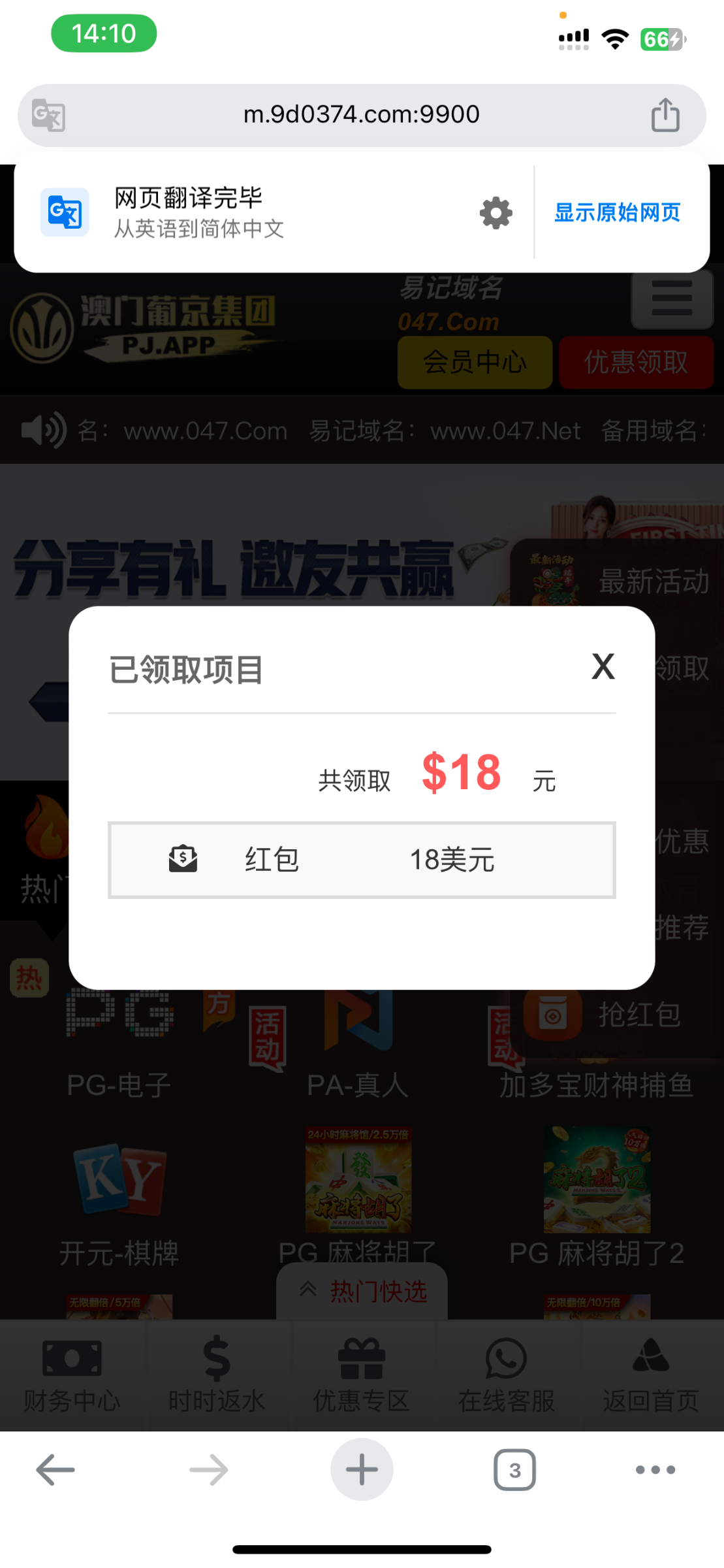 电话打来的登录后就跳出来了,有号的可以登录看看,电话里说可以领两天还是啥没听清。好久之前注册的号了没充值过。白嫖即可!!说是说怎么显示18美元呜呜呜,网址047.com
